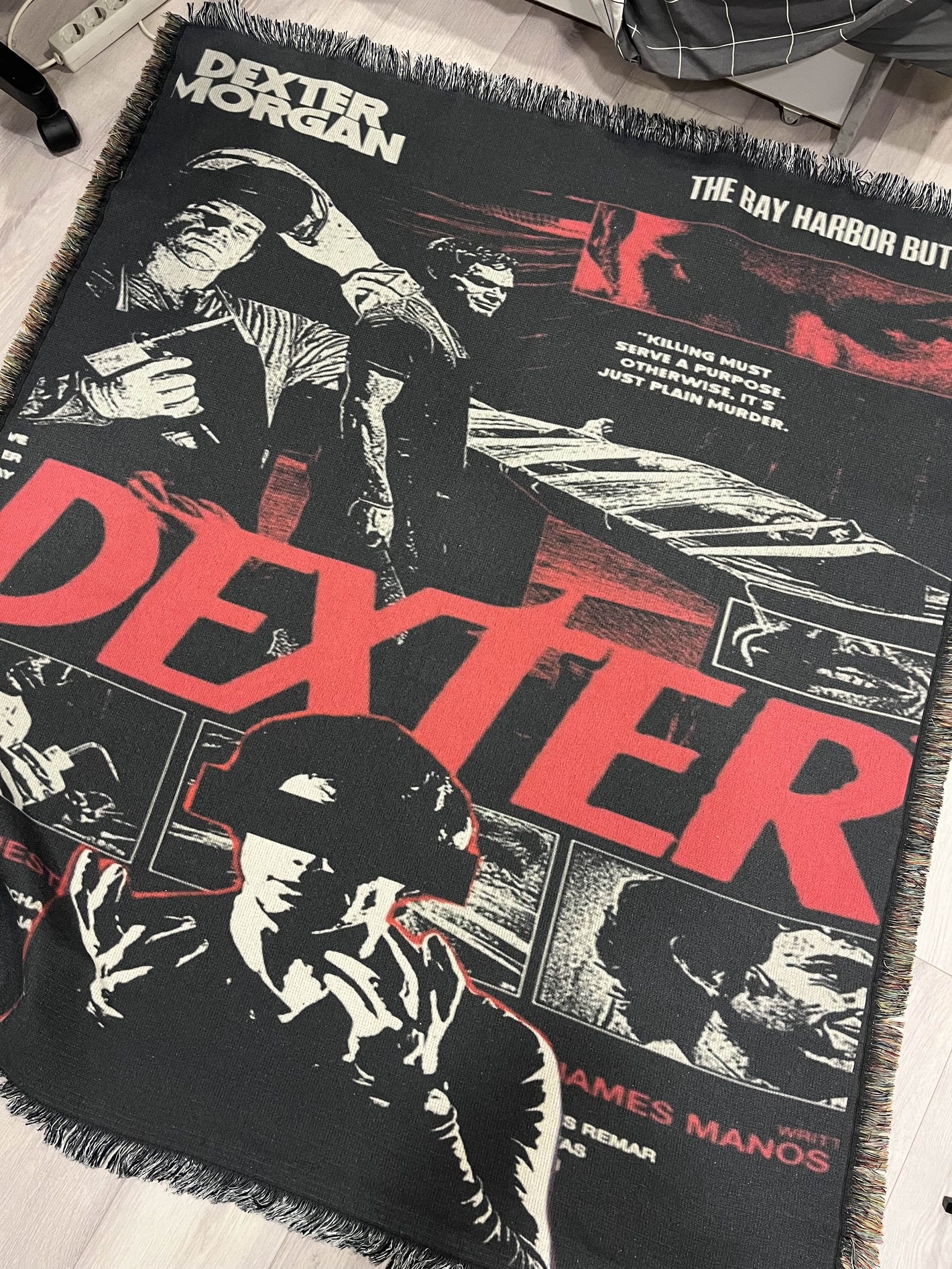 Each Dex Woven Blanket is custom-made by our hands, crafted with care and passion — by a true Dexter fan, with love.